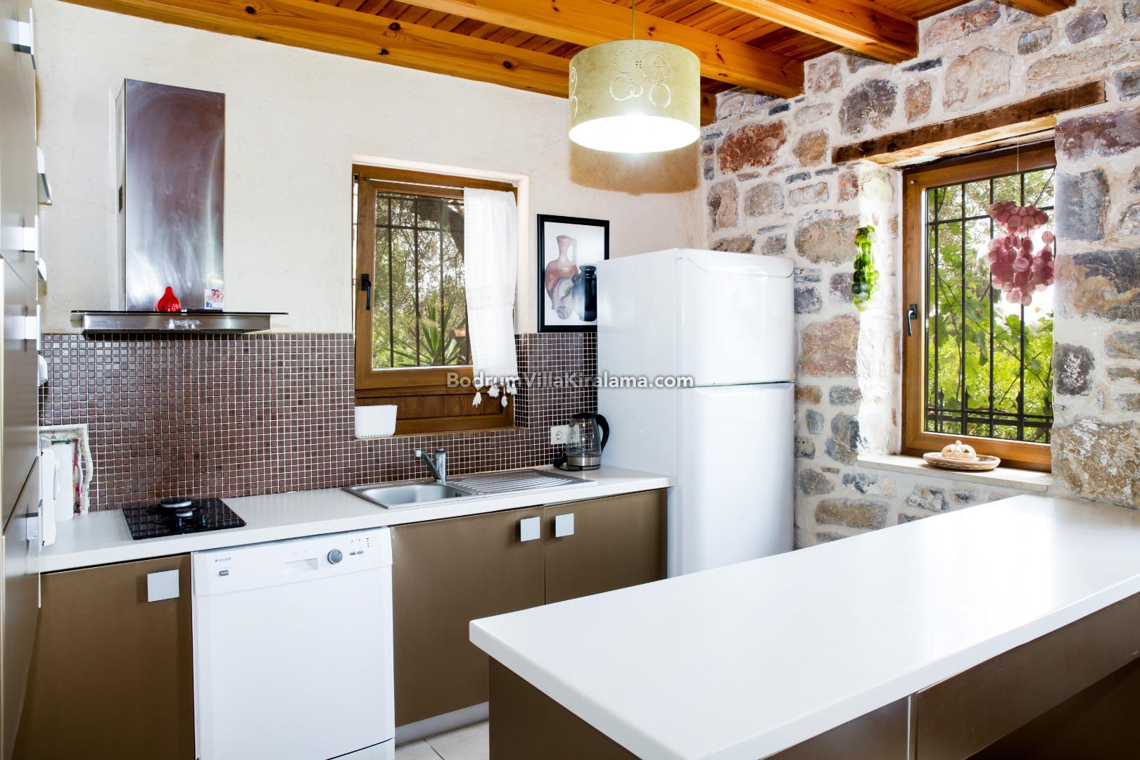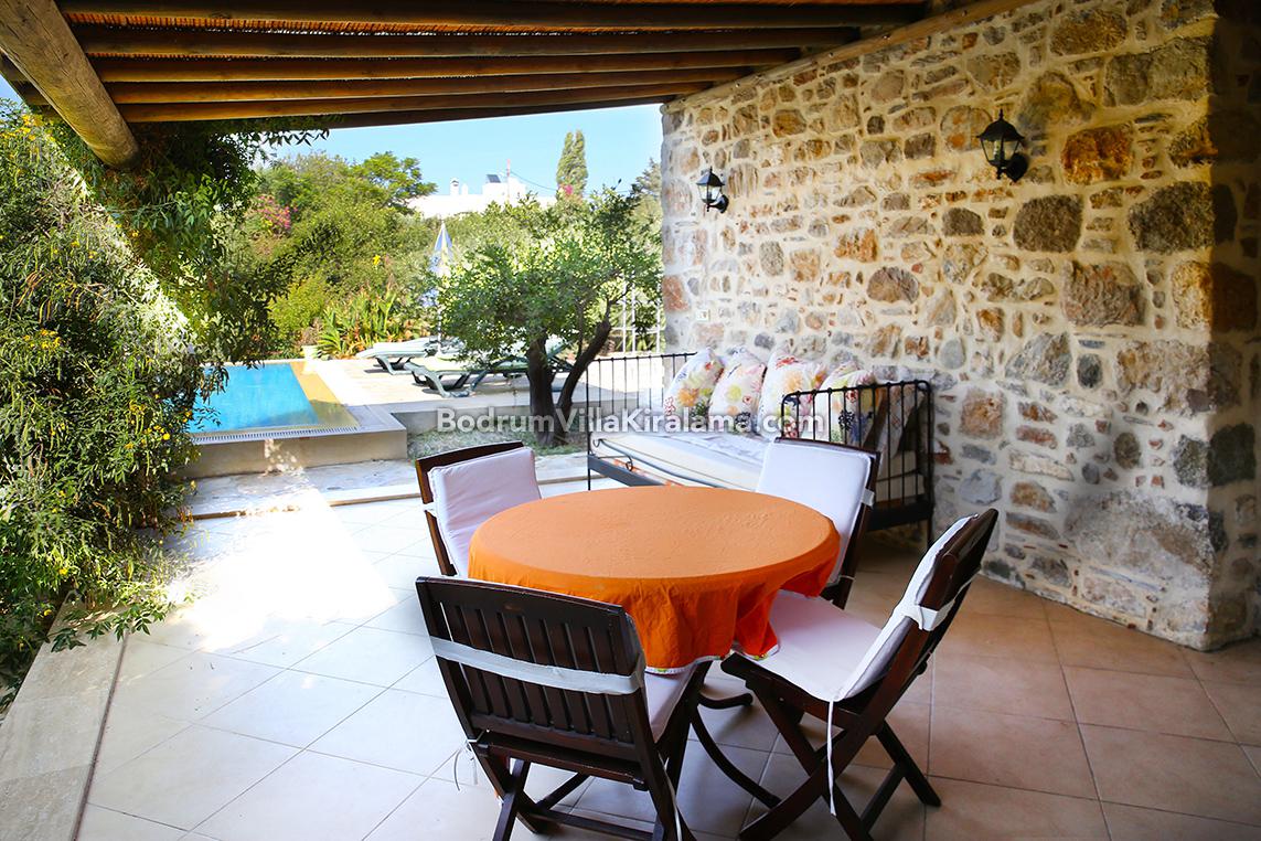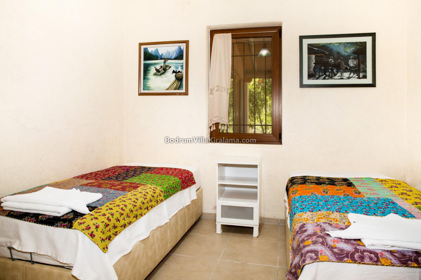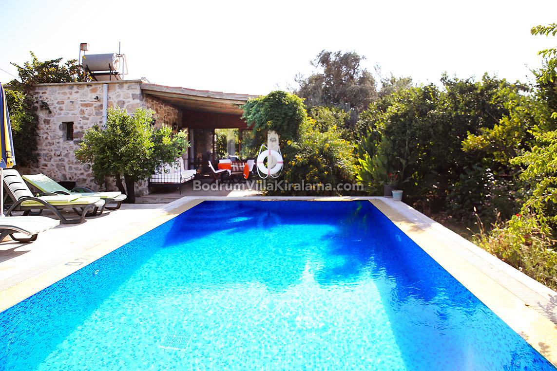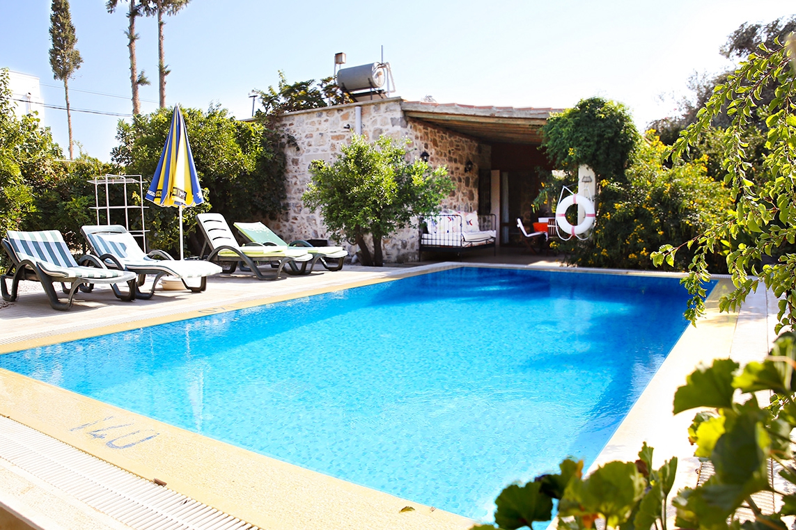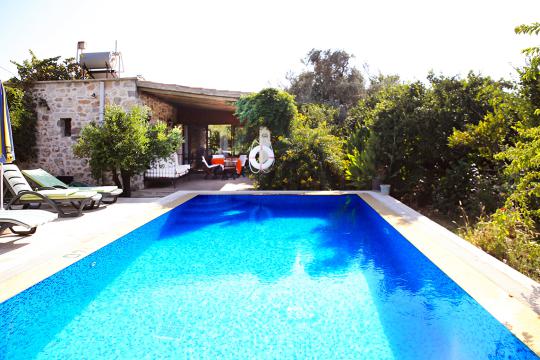 Bitez'de 1500 m2 Mandalina Bahçesi içerisinde bulunan Villamız Özel havuzlu olup ,tek katlıdır.Tamamen Taş Malzeme kullanılarak yapılan evimizde toplam 2 yatak odası ( bir çift kişilik yataka ve iki tek kişilik olmak üzere ) bir tane ebeveyn banyo bulunmaktadır.Salonda bulunan çekyatla birlikte 5 kişiye kadar konaklama yapılabilmektedir.