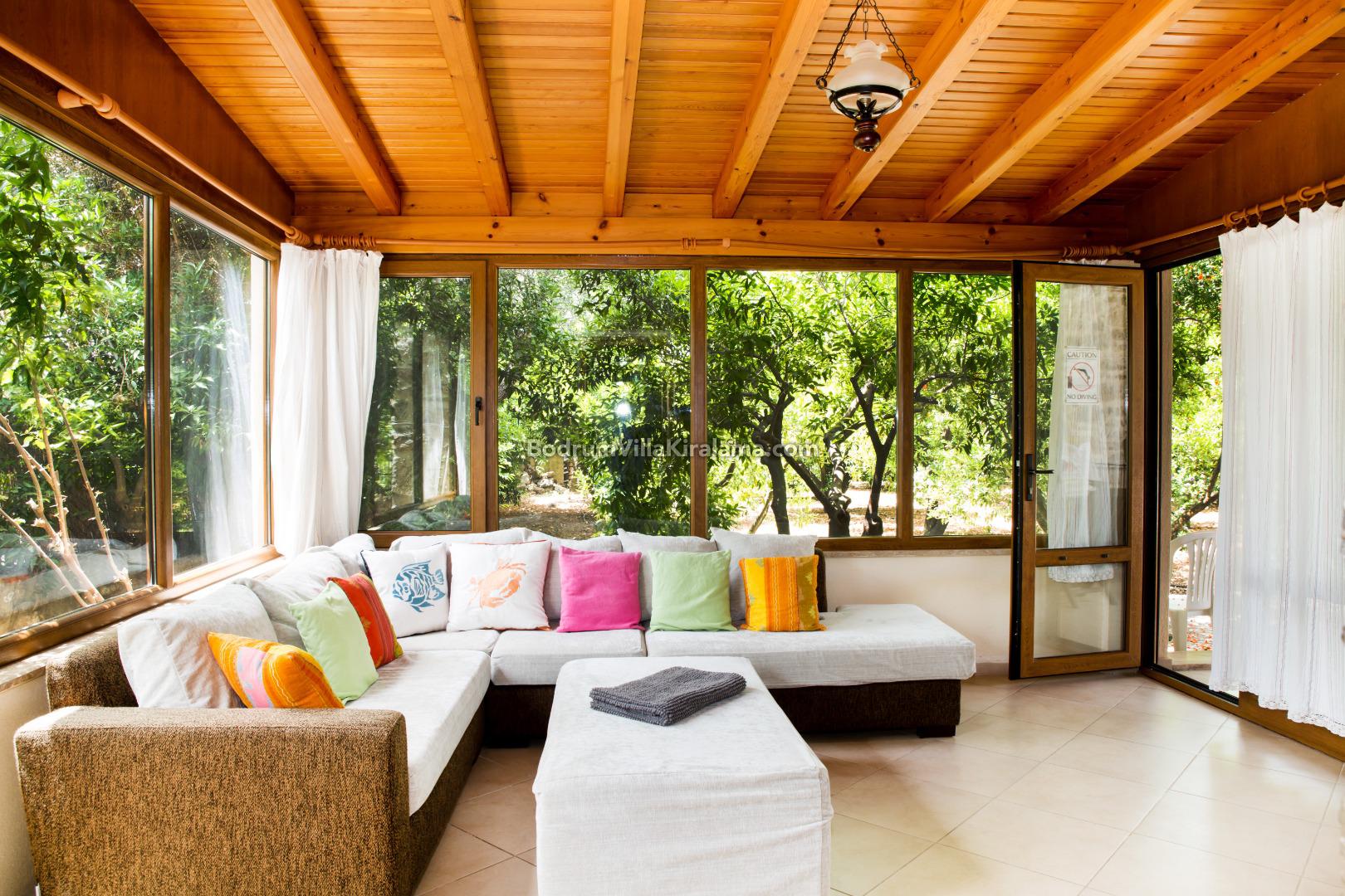 Salon bölümünden havuza çıkarken ayrıca TV ve oturma grubunun bulunduğu bir oturma alanı daha vardır.Havuzun hemen yanında bulunan veranda da akşam yemeklerinizi yerken Ağaçlardan yayılan mandalina ve limon kokularının keyfini de çıkartabilirsiniz.