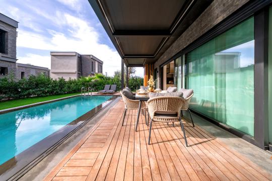 Villaya giriş katında açık mutfak ve salon yer almakta olup, bu katta ayrıca bir WC bulunmaktadır. Salondan, özel havuz terasına ve bahçeye doğrudan çıkış yapılabilir. Villa, ikinci katta ebeveyn banyolu iki yatak odasına sahip; birinde çift kişilik yatak, diğerinde ise iki tek kişilik yatak bulunmaktadır. İstenirse tek kişilik yataklar birleştirilebilir. En alt katında da yine ikisi de ebeveyn banyolu iki yatak odası yer almakta olup, biri çift kişilik diğeri ise iki tek kişilik yataklardan oluşmaktadır.