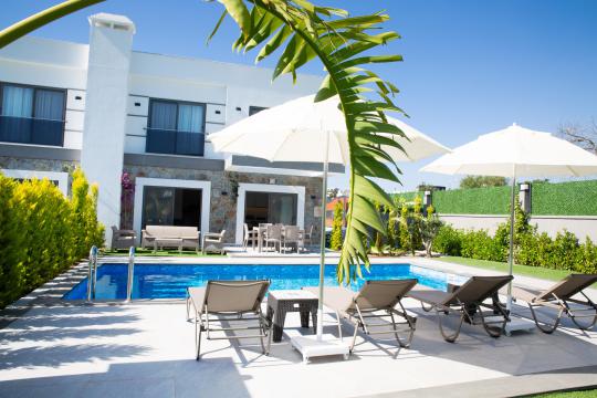 Villamızın giriş katında konforlu bir oturma alanı, tam donanımlı mutfak ve bahçeye/havuza doğrudan geçiş bulunurken, üst katta 2 adet çift kişilik yataklı yatak odası yer alır. Her iki odada da klima ve televizyon mevcuttur. Çocuklar dahil maksimum 5 kişilik konaklama kapasitesine sahiptir.