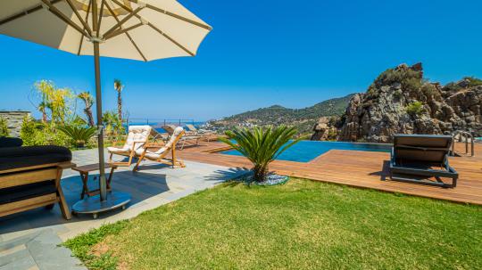 Villanın bahçe kısmında ayrıca bir açık mutfak, salon, bir yatak odası (çift kişilik yatak) ve bir banyo bulunan müstakil bir yardımcı odası (müştemilat) bulunuyor. Bu özellik, özellikle yardımcı aileler için idealdir. Villa Rock, sade ve şık döşenmiş iç mekanıyla 8 kişiye kadar konaklama kapasitesine sahiptir.
