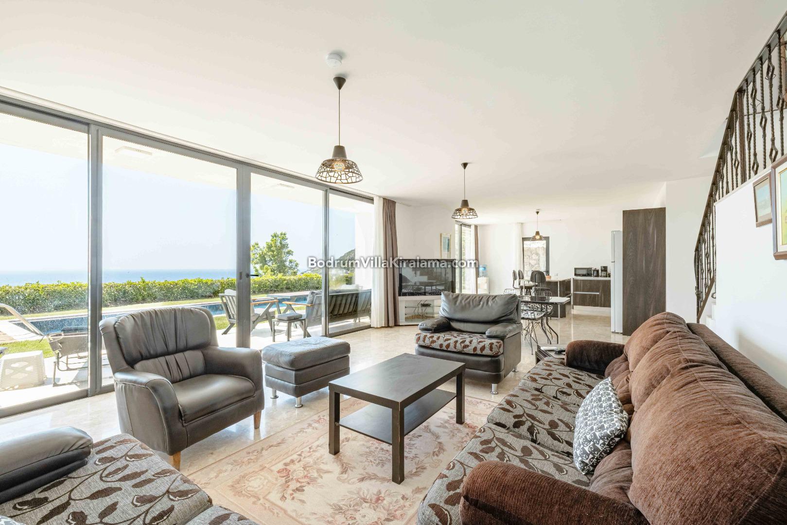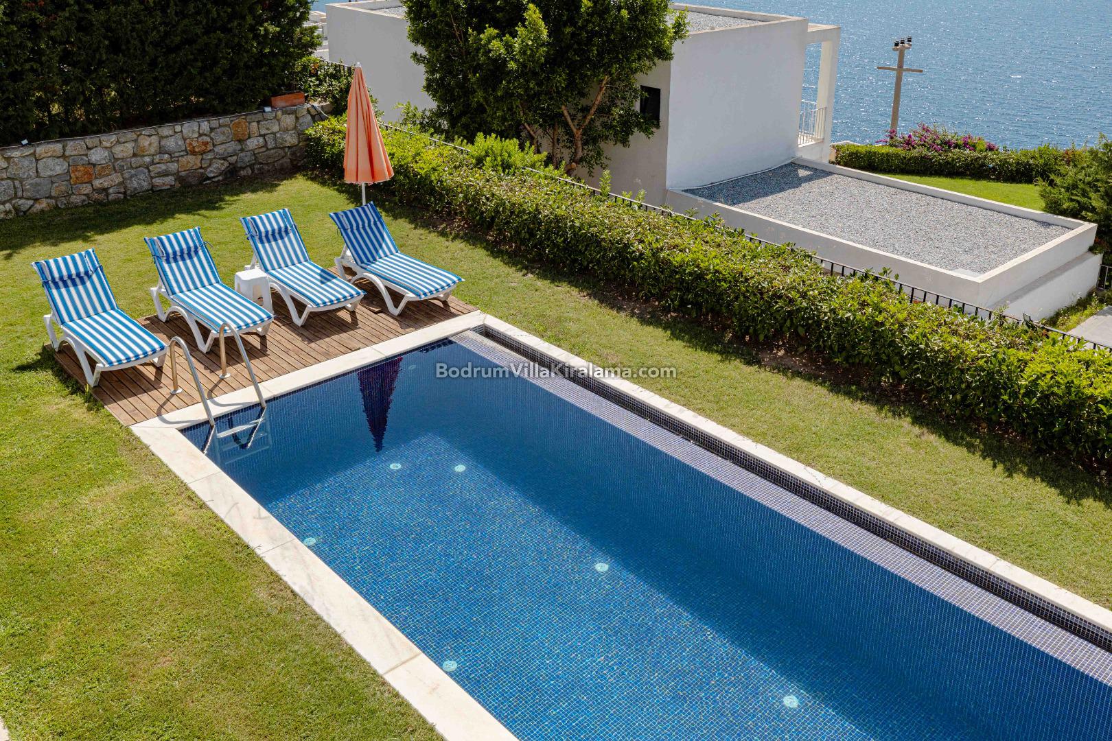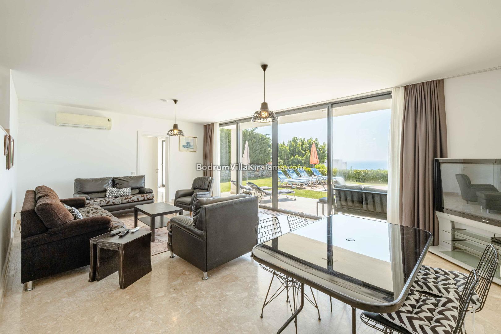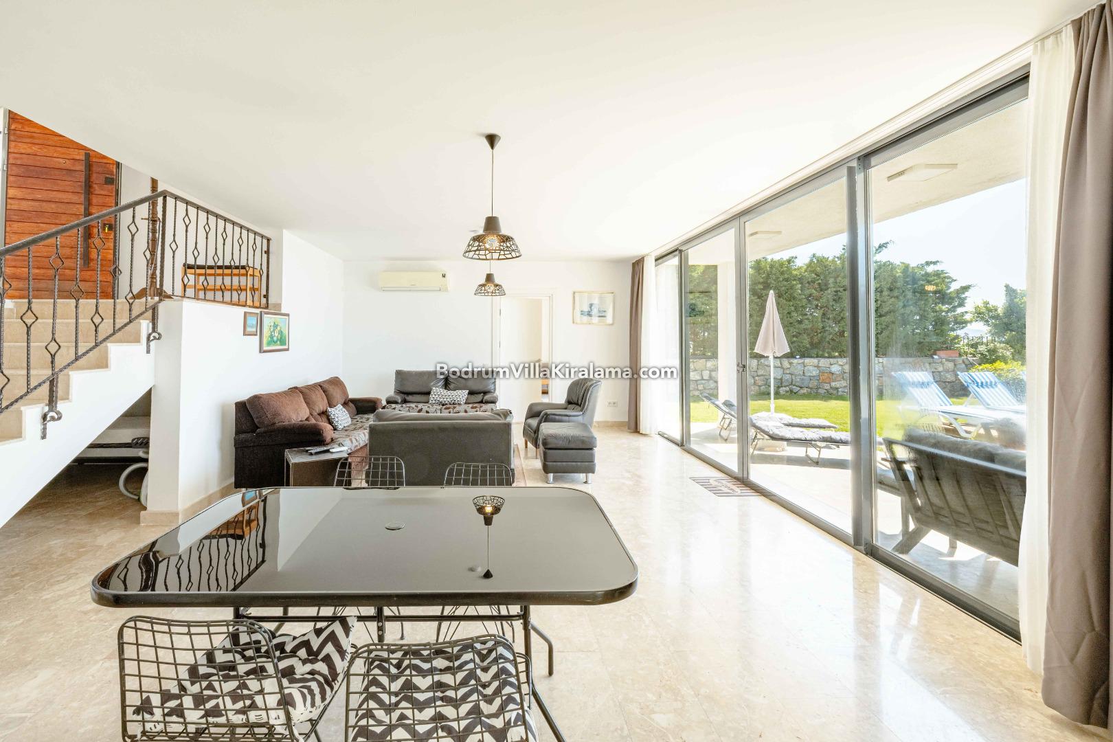 Salon bölümünden geniş bahçeye ve havuza ulaşabilirsiniz.Yine bu alanda keyifli zamanlar geçirebileceğiniz bir veranda bulunmaktadır.İster havuz başında güneşin tadını çıkartın istersiniz de akşam yemeklerinizde denizin tadına varın..