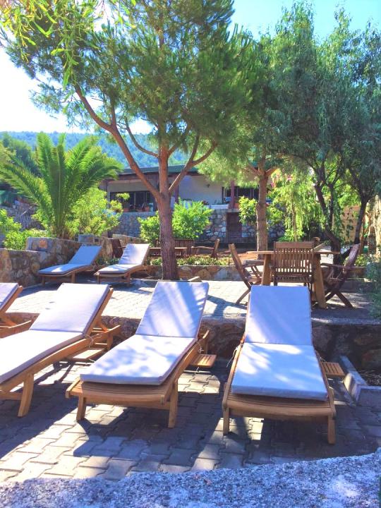 Geniş balkonda, bahçe ve deniz manzarası eşliğinde bir kadeh şarap, rakı veya soğuk bir bira içebilirsiniz.